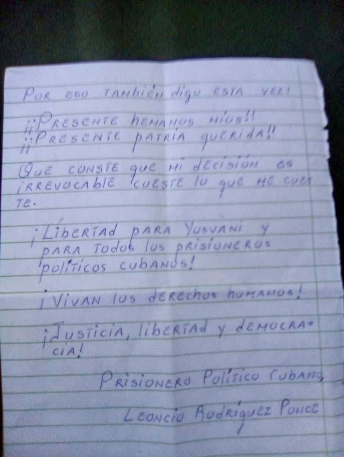 En la publicación se puede leer una carta manuscrita donde el preso político da a conocer que se une resueltamente, reclamando a la dictadura fe de vida de Yosvany Rosell, además menciona que existen en Cuba al menos 10 presos políticos más en huelga de hambre.